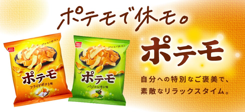 『ポテモ』は、毎日の疲れた心にそっと寄り添う、リラックスしたいときにぴったりなポテトスナック菓子。一日の終わりにほっと一息つく自分時間のおともに、お好きな飲み物とともにお楽しみください。