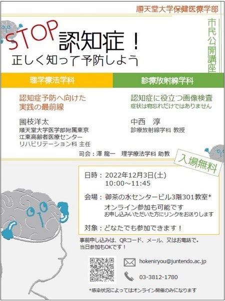 順天堂大学保健医療学部による市民公開講座「STOP 認知症!正しく知って予防しよう」を2022年12月3日(土)に開催します。皆様のご参加をお待ちしております。