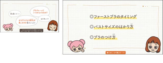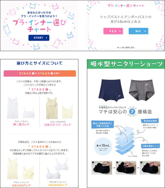 「トップがふくらみ始めたら・・・」「全体がふくらみ始めたら・・・」など発育に合わせた下着選びや、話題の吸水型サニタリーショーツについてもわかりやすく紹介しています。「ブラ・インナー選びチャート」など、お友達同士、保護者の方と楽しめるコンテンツも揃え、成長する女の子をサポートします。