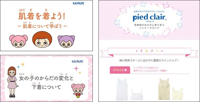 本動画は、「肌着の役割」「肌着の種類」などを学ぶ基礎編と、女の子のカラダの変化と下着について学ぶジュニアインナー編の2種類です。長年肌着とカラダの関係を研究し続けてきたグンゼが考える❝肌着の大切さ❞をキャラクターを通じてわかりやすくまとめています。また、動画公開に合わせて、成長期の女の子に寄り添うジュニアインナーブランド「ピエクレール」のブランドサイトもリニューアル。胸の発育ステージに合わせたトップス、吸水型サニタリーショーツなどの商品特長や選び方をわかりやすく紹介しています。