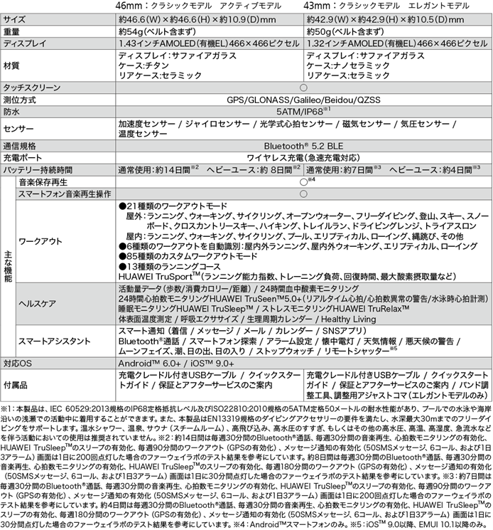 『HUAWEI WATCH GT 3 Pro』の主な仕様