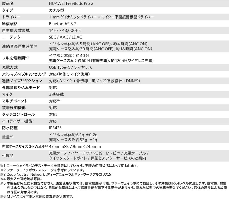 『HUAWEI FreeBuds Pro 2』の主な仕様