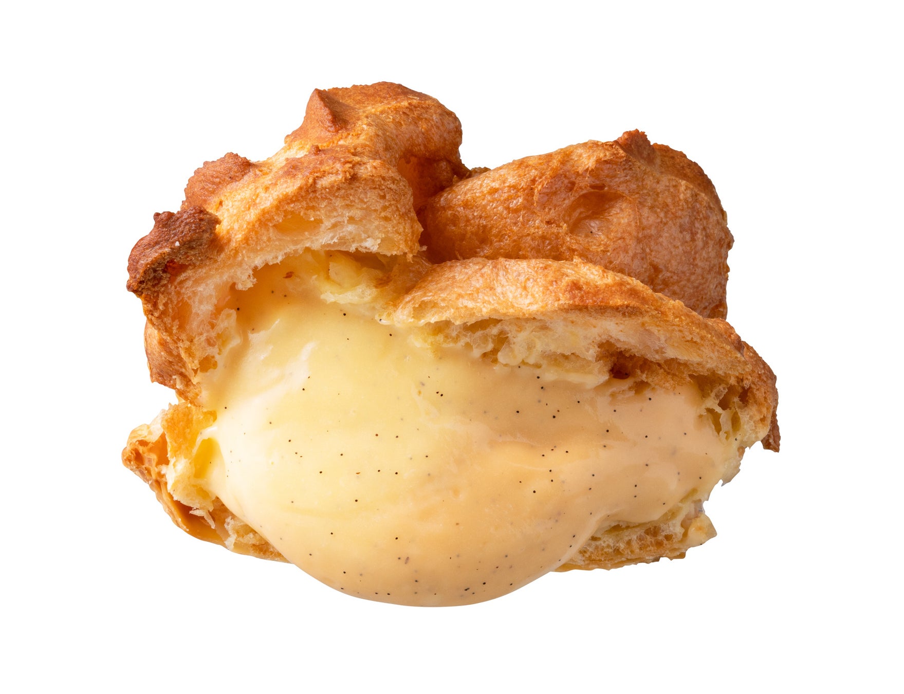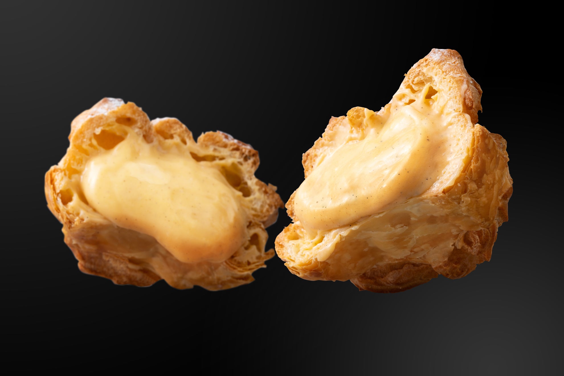 食べる瞬間に、最高の状態のカスタードクリームを食べて欲しいからじっくりと時間をかけて美味しさをとじ込めました。直前に温めることで、とろける食感や甘くて優しい香りが溢れ出る。その瞬間に最高の純生カスタードクリームの出来上がり!そのカスタードクリームをさらに美味しく楽しむ為に、サクサクのシュー生地をキャラメリゼしてビターな味わいに仕上げました。