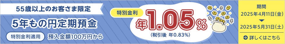 キャンペーン期間中、「アクティブシニア円定期」をお預入れの場合、5年もの円定期預金に特別金利年1.05%(税引後 年0.83%)を適用します。 ※通常金利 年0.50%(税引前)に加えて年0.55%(税引前)の金利が上乗せとなります。 ※特別金利は当初5年のみ適用となります。 ※お預入れ金額および回数に上限はありません。 |
