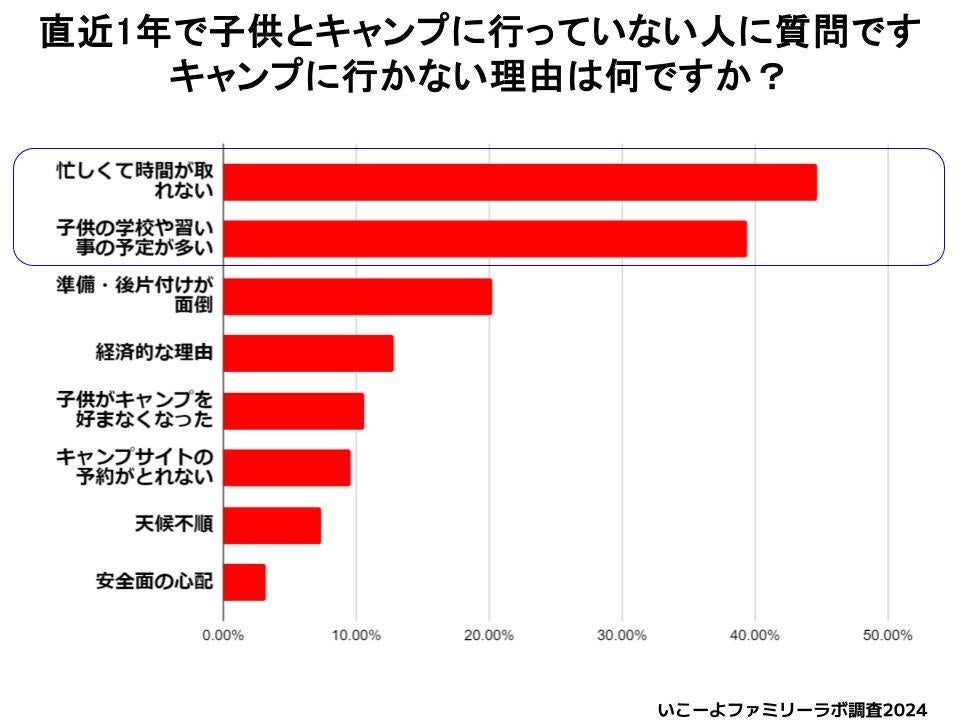 キャンプに行かなかった理由としては最も多く「忙しくて時間が取れない」があげられ、次いで「子供の学校や習い事の予定が多い」という回答が多く、キャンプに行けない理由は現代の家庭が多忙であることが影響していると考えられます。