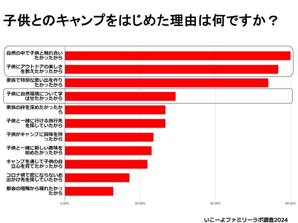 「子供に自然環境について学ばせたかったから」という答えも約30%あり、親がキャンプを通じて自然との触れ合いを通した教育的な効果を期待していることがうかがえます。