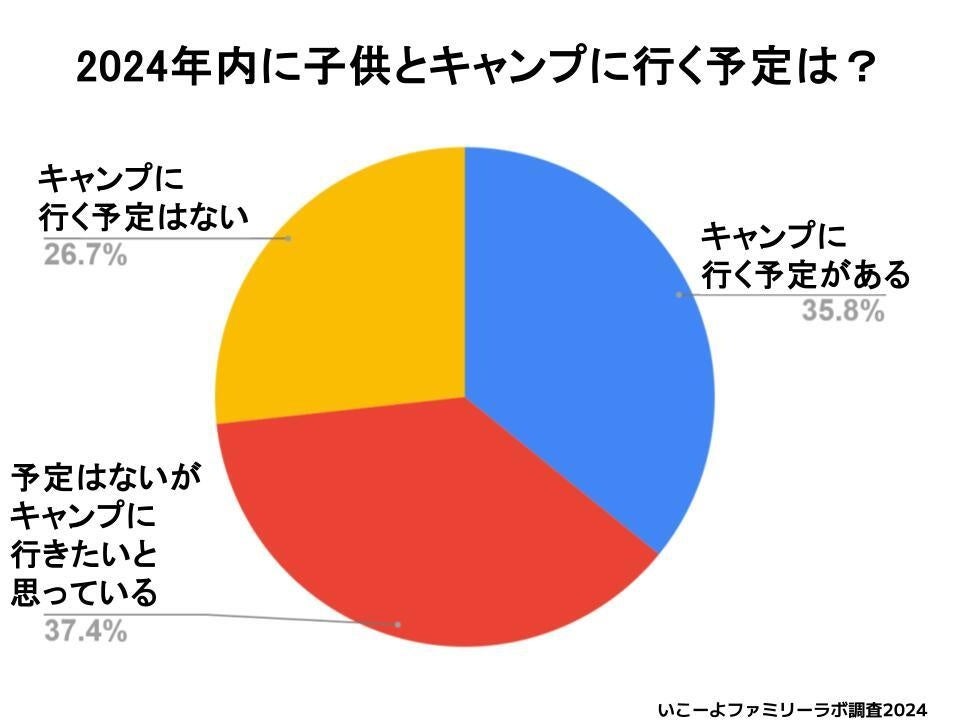 実際にキャンプに行けている家庭は少ないものの、2024年内にキャンプに行く予定についての質問に対して、「予定はないがキャンプに行きたいと思っている」(37.4%)が最も多く、続いて「キャンプに行く予定がある」(35.8%)となり、合わせて7割以上の家族が、キャンプへの高い関心をもっているという結果に。