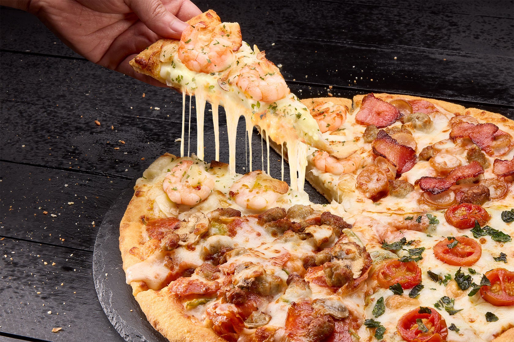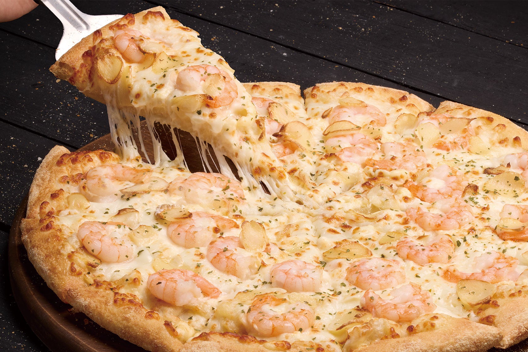 ぷりぷりの大エビが通常の2倍で味も見た目も豪華な1枚!ガーリックの香ばしさと特製マヨソースの濃厚な味わいが、たーーっぷりチーズとベストマッチ。