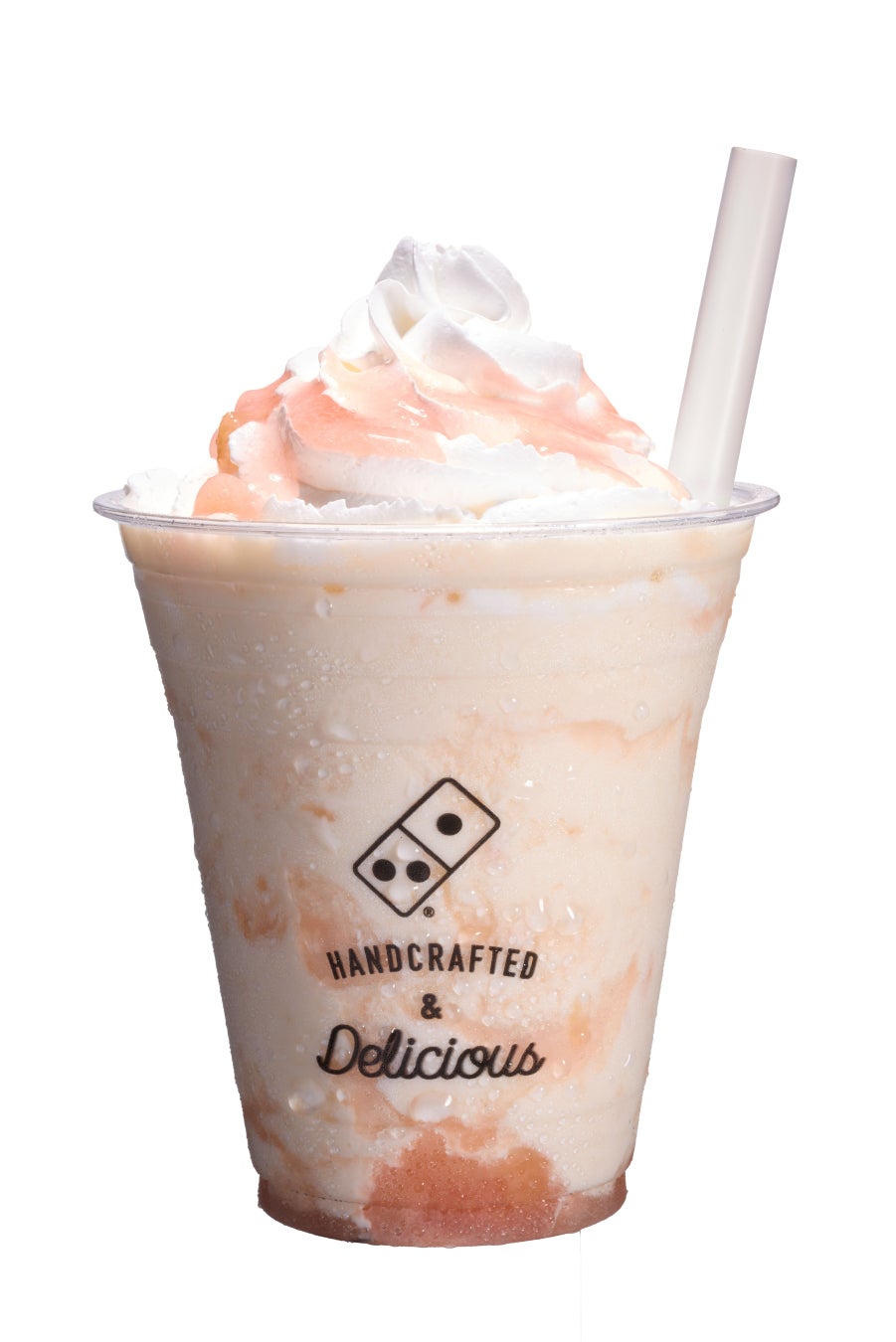 夏の定番フルーツ・ピーチが「ドミノシェイク」でお楽しみいただけます。ほんのり色づいたピンク色の見た目と、甘くてやさしい味わいが特徴です。ソースに使用している果肉は、ほどよく食感が味わえるように、ストローでも食べやすいサイズになるよう、工夫しています。