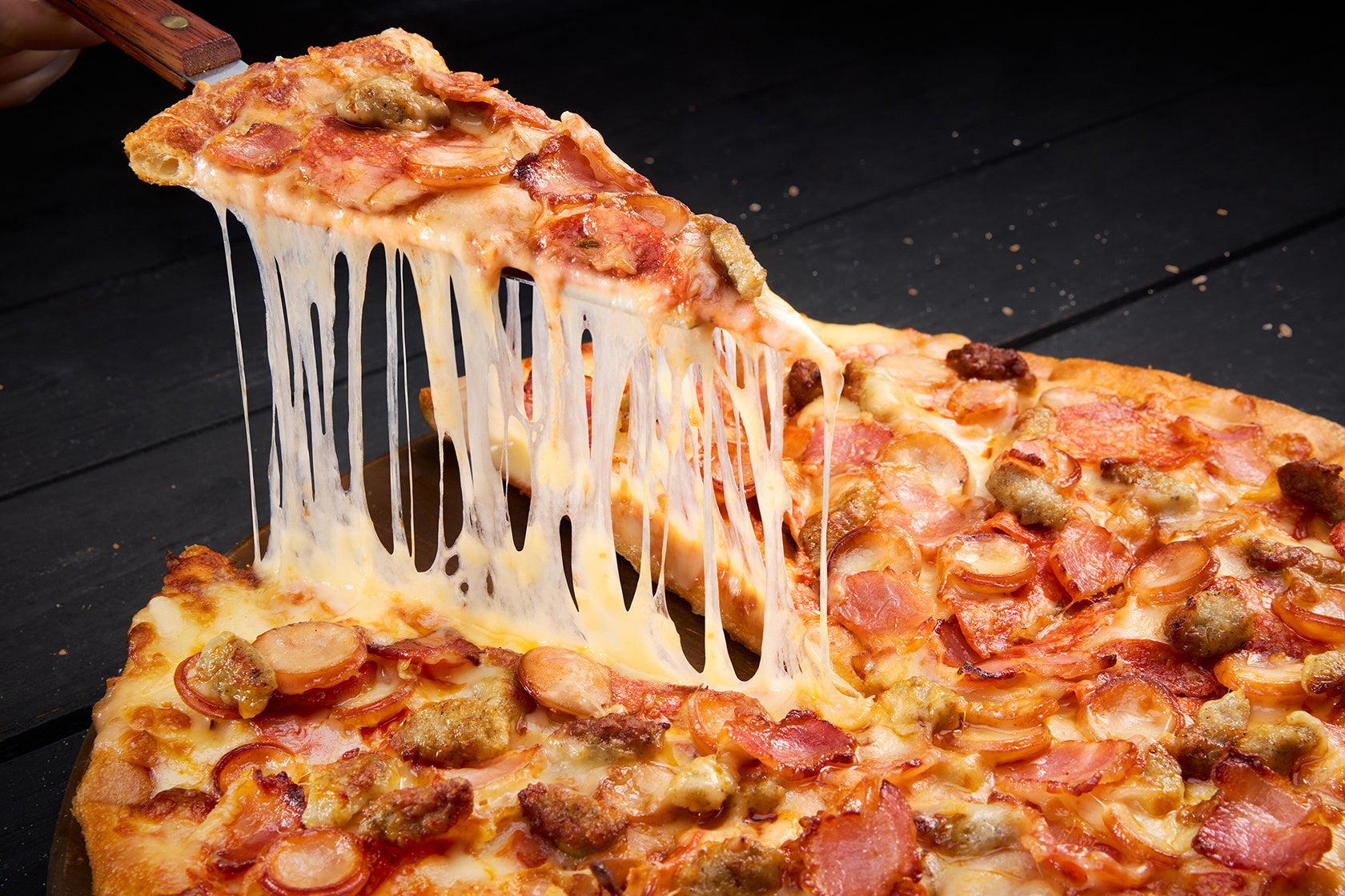 ペパロニ、イタリアンソーセージ、粗挽きソーセージ、燻しベーコンのお肉4種が全部1.5倍!肉×肉×肉×肉でボリューム満点!食べ応え抜群です。