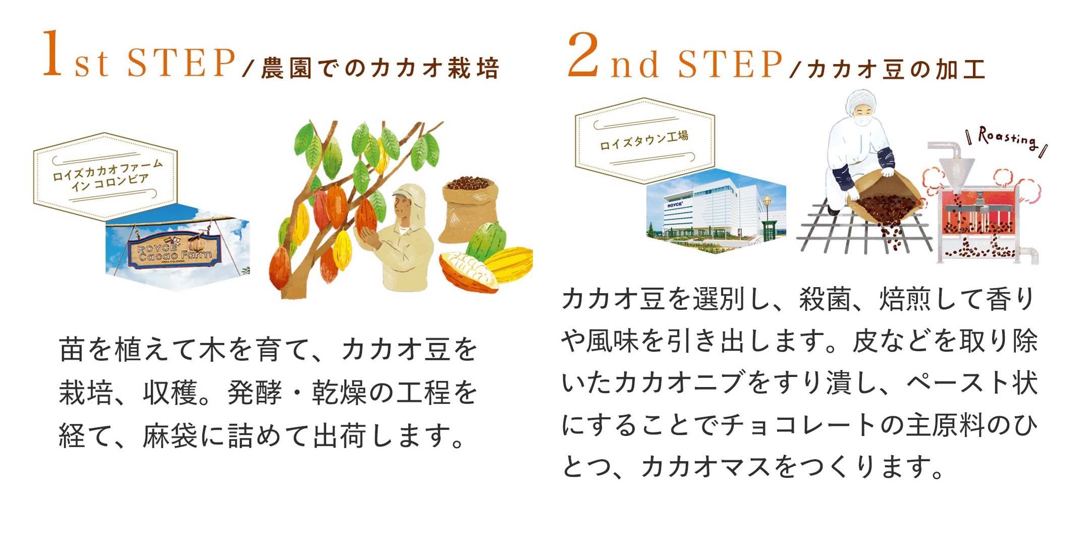 コロンビアの人たちとともに開拓した自社農園(Farm)、そこで大切に育てたカカオ豆を使い、自らの工場で一貫してつくりあげたチョコレート(Bar)。農園づくりからカカオの栽培、カカオ豆の加工、チョコレート製品にいたるまでのすべての工程を手がけ、追い求めたチョコレートが“ロイズファームトゥーバー”です。