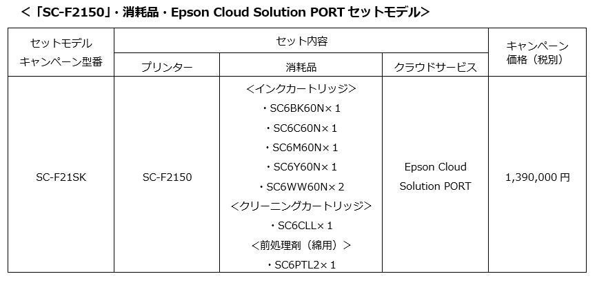 今回、プリンターご導入後、すぐにご使用いただけるよう消耗品(インクカートリッジ、クリーニングカートリッジ、綿用前処理剤)、「Epson Cloud Solution PORT」をセットにしたキャンペーンモデルを、期間限定で発売します。