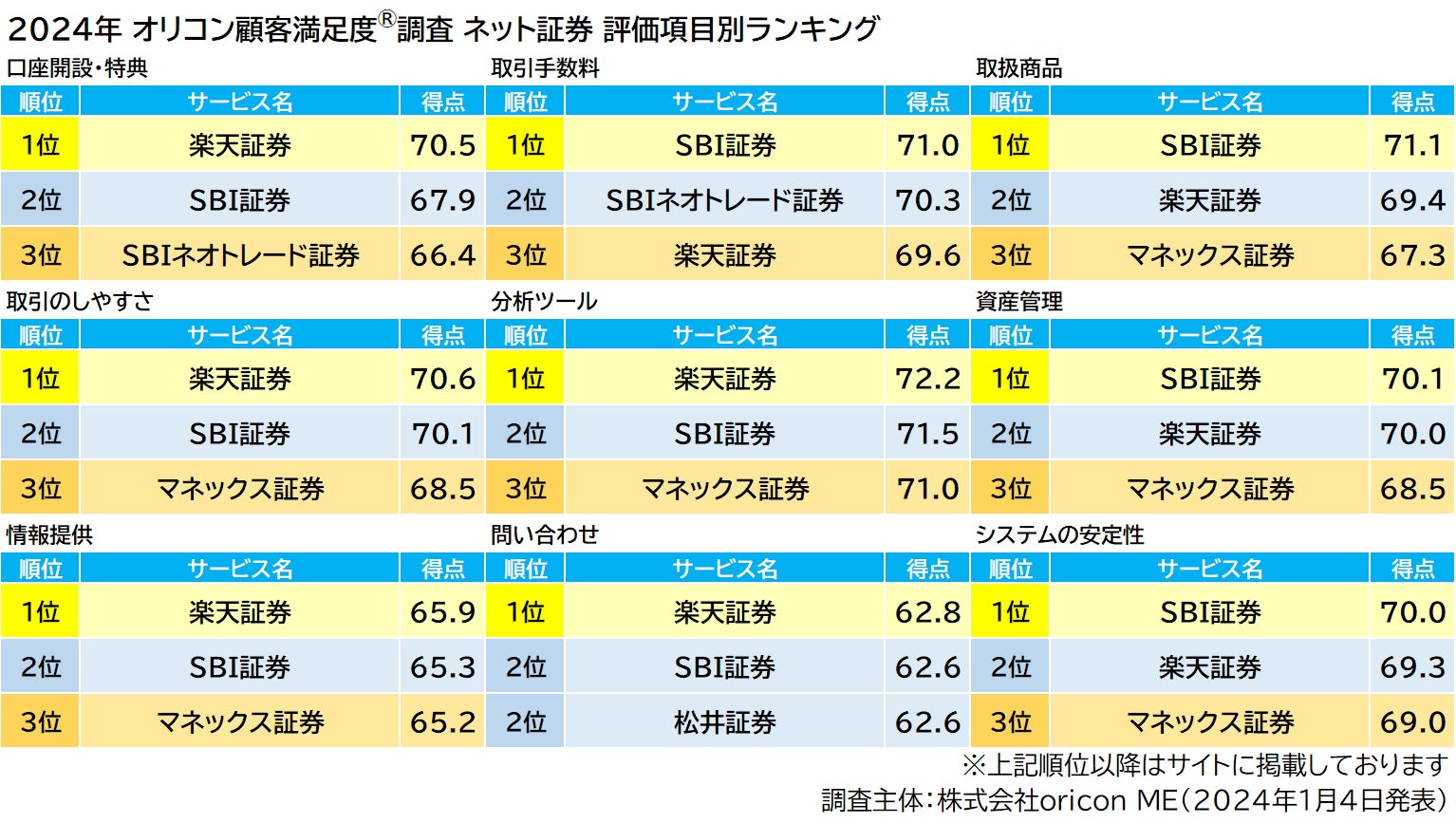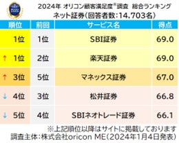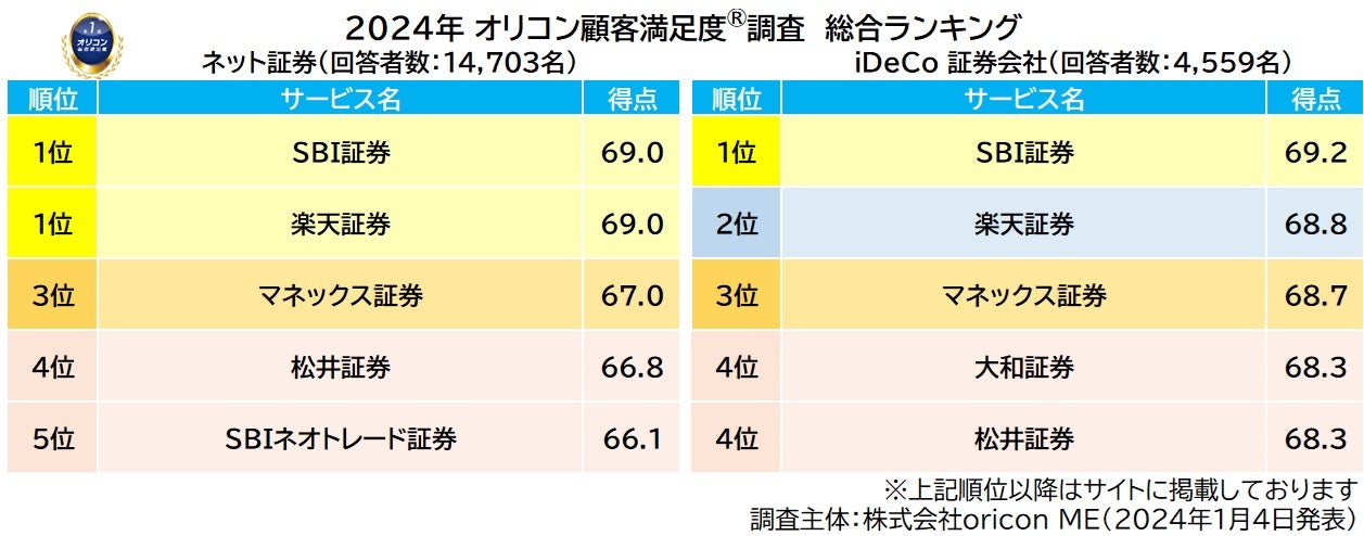 2024年 満足度の高い“証券会社”ランキング |『ネット証券』【SBI証券】と【楽天証券】が同点で総合1位;【SBI証券】は2年連続15度目、【楽天証券】は2年ぶり3度目(オリコン顧客満足度)