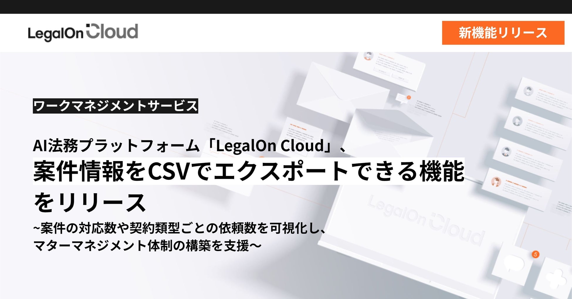 株式会社LegalOn Technologies(本社:東京都渋谷区 代表取締役 執行役員・CEO:角田 望)が提供する、法務業務全体を包括的に支援するAI法務プラットフォーム「LegalOn Cloud」は、案件情報をCSVファイルでエクスポートできる機能をリリースしました。今回のアップデートで、ユーザーが対応した案件数や契約類型ごとの依頼数などの集計・分析作業が簡単にでき、各社のマターマネジメント体制の構築を支援します。