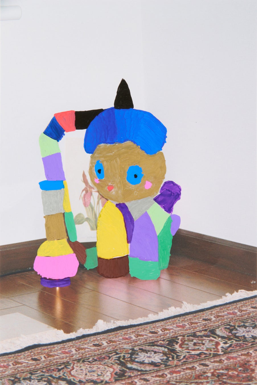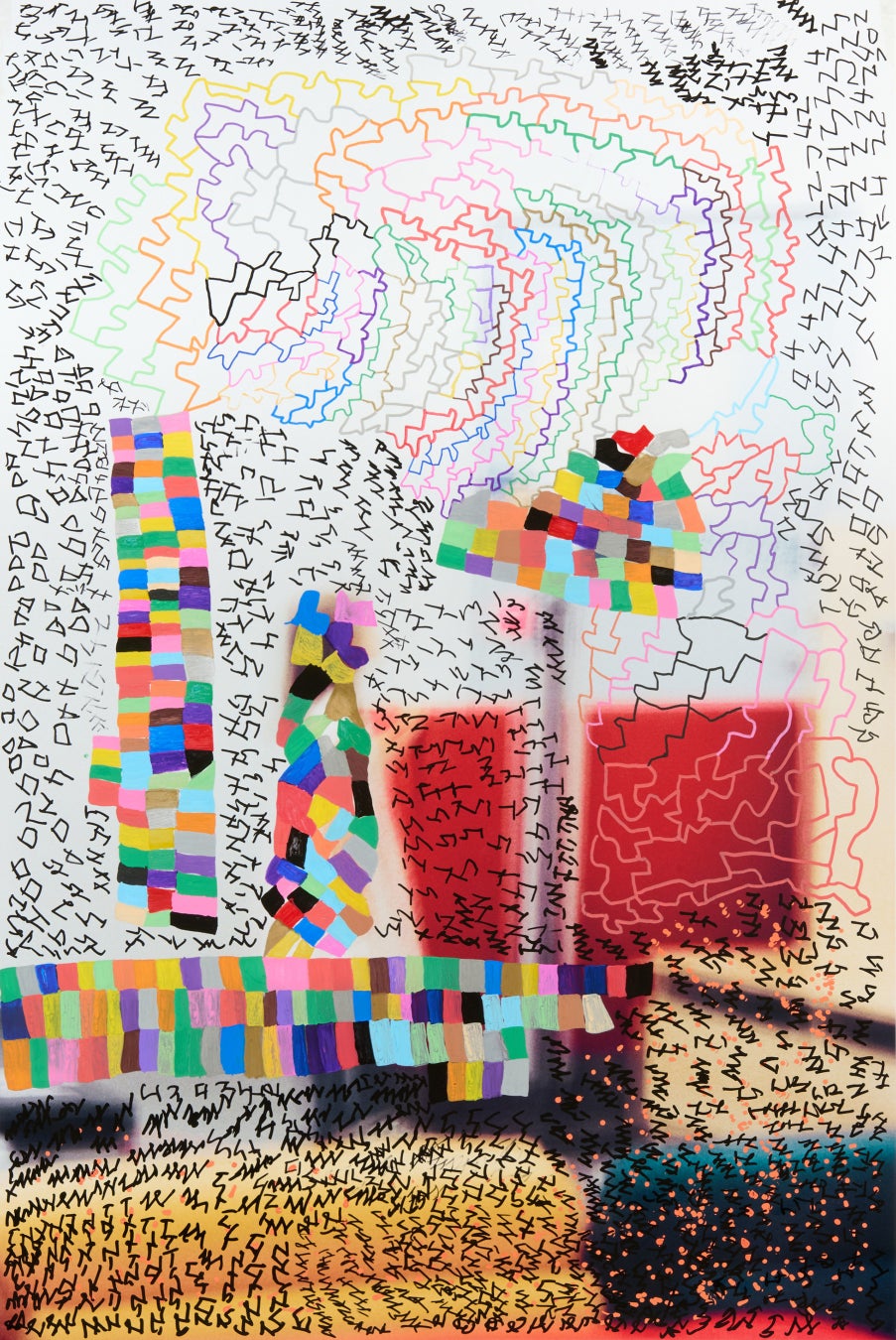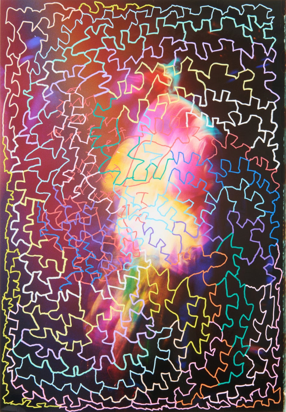 1996年生まれ 滋賀県在住 2015年から『やまなみ工房』に在籍 彼は必ず画用紙の左上から順に形を描いていく。ひとつひとつの「形」はまず複数のピースが重なり合うかのように輪郭が描かれ、次に色に持ち替え中が一面ずつ着色されていく。一連の動作を繰り返し、一つの「形」が出来上がると再び輪郭を描き、色を塗り、それらが徐々に列を成していく。 一見何の意味もない図形の繰り返しの様にも見えるが、時に目が描かれたり、手足や角、長い耳のような突起が現れたり、傍に大きなモチーフが描かれたりと、その表情は様々だ。 ゲームのキャラクターや食べ物、建造物等、生活する上で好きなものや見たもの体験した事がそのまま作品に反映されている。