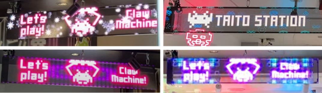 また、秋葉原自由通路店ならではの目印が看板の高さに設置された横長のデジタルサイネージです。 タイトーステーションのアイコンでもあるスペースインベーダーやクリスマスなどの季節のデザインが色鮮やかに、さまざま切り替わります。是非、店頭でいろいろなデザインを楽しんでください。