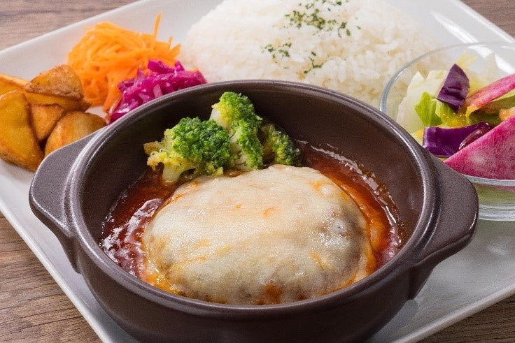 ふっくらジューシーに焼きあがるように配合にこだわった、牛肉と豚肉の合い挽き肉のハンバーグです。特製トマトオニオンソースとチーズをトッピングして肉汁が逃げないようにオーブンで焼きあげました。