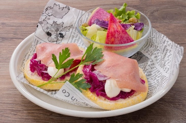 トーストしたイングリッシュマフィンに、赤キャベツの マリネ、生ハムとモッツァレラチーズをトッピングしました。(ミニサラダ付き)