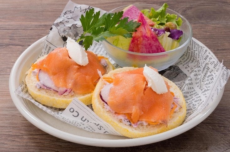 トーストしたイングリッシュマフィンに、特製のしば漬けタルタルソース、スモークサーモンを合わせました。(ミニサラダ付き)