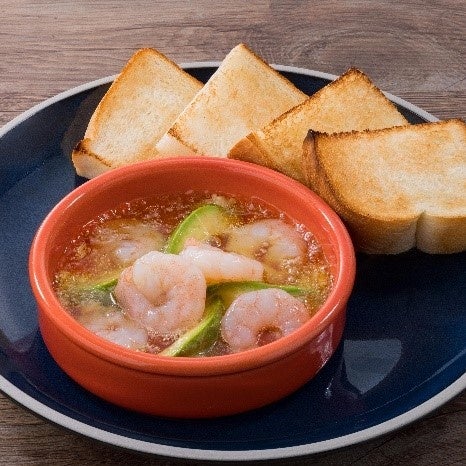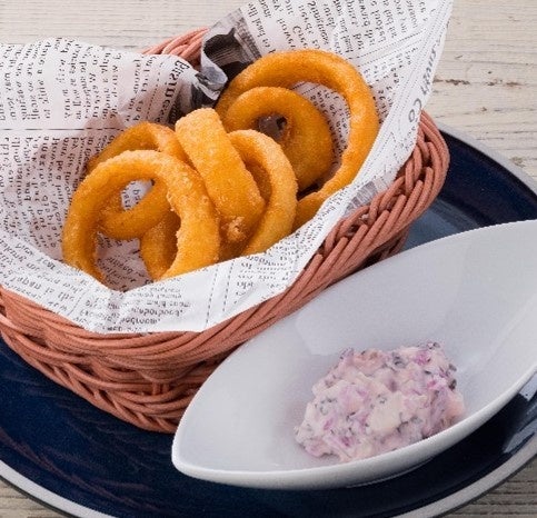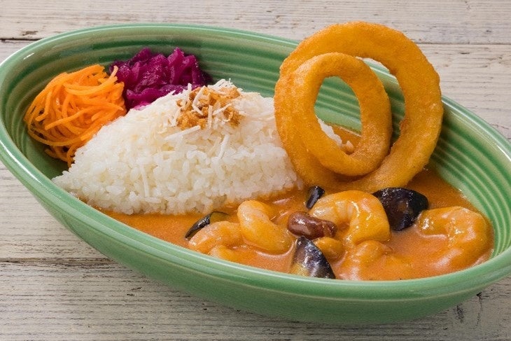辛さを抑えたマイルドな味わいのココナッツカレーに小海老、揚げナス、ミックスビー ンズを合わせた具沢山のカレーです。サクサク食感のオニオンリングをトッピングしました。