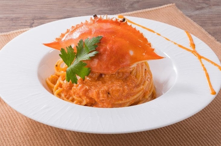 渡り蟹のほぐし身と、ビスクソースを加えたトマト クリームソースで贅沢に仕上げたパスタです。