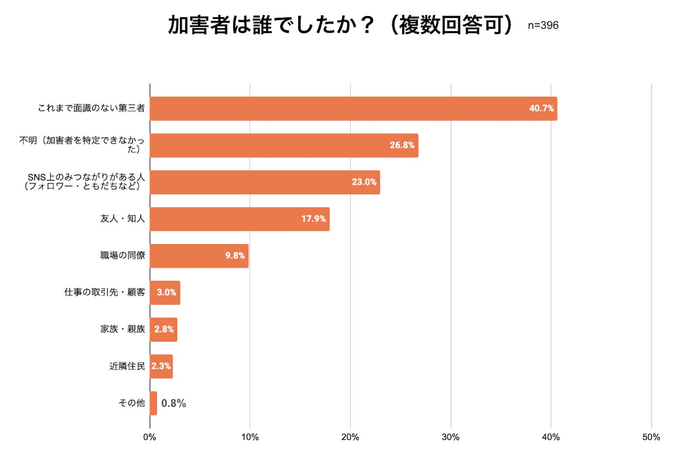 「加害者について」尋ねたところ、「面識の無い第三者」が40.7%と最も多く、次いで「SNS上のみつながりがある人」が23.0%、「友人・知人」が17.9%と続きました。一方で、「加害者を特定できなかった」という声も26.8%にのぼりました。