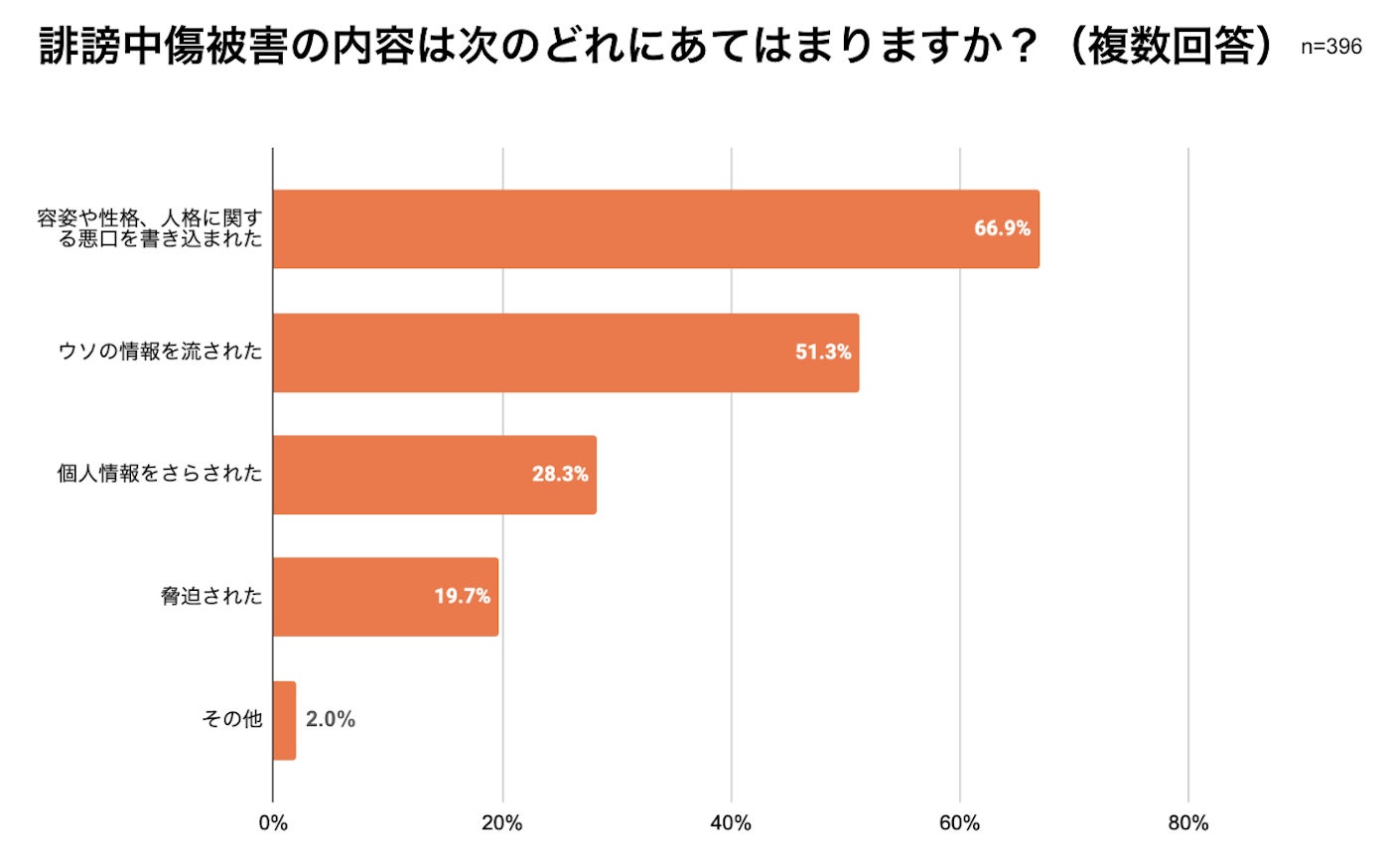 「誹謗中傷の被害の内容」も尋ねたところ、「容姿や性格、人格に関する悪口」が66.9%と最も多く、次いで、「ウソの情報を流された」が51.3%、「個人情報をさらされた」が28.3%、「脅迫された」が19.7%と続きました。
