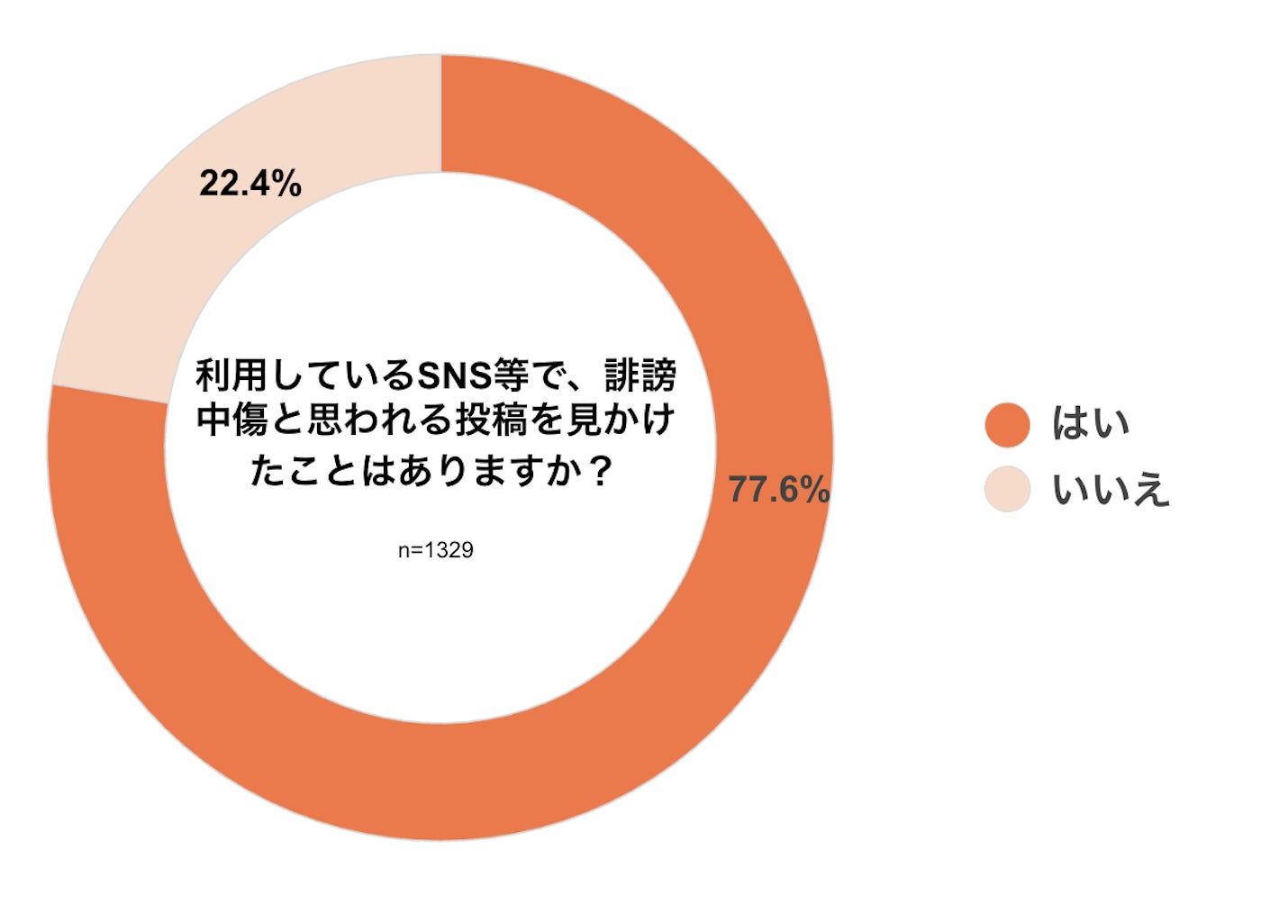 「ネット・SNS上で誹謗中傷と思われる投稿を見たことがあるか」と尋ねたところ、77.6%が「ある」と回答しました。