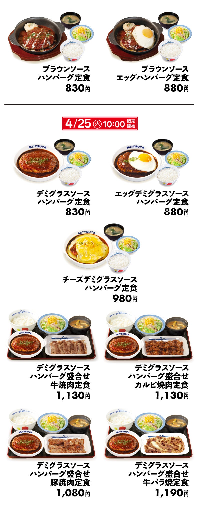 | 商品名 デミグラスソースハンバーグ定食 830円 エッグデミグラスソースハンバーグ定食 880円 チーズデミグラスソースハンバーグ定食 980円 デミグラスハンバーグ盛合せ豚焼肉定食 1,080円 デミグラスハンバーグ盛合せ牛焼肉定食 1,130円 デミグラスハンバーグ盛合せカルビ焼肉定食 1,130円 デミグラスハンバーグ盛合せ牛バラ焼定食 1,190円 ※お持ち帰りいただけます。お持ち帰りにみそ汁は付きません。 お持ち帰りの場合、みそ汁は別途60円でお求めいただけます。 ※税込み価格です。 発売日 2023年4月25日(火)午前10時 ~ 対象店舗 一部店舗を除く全国の松屋 |