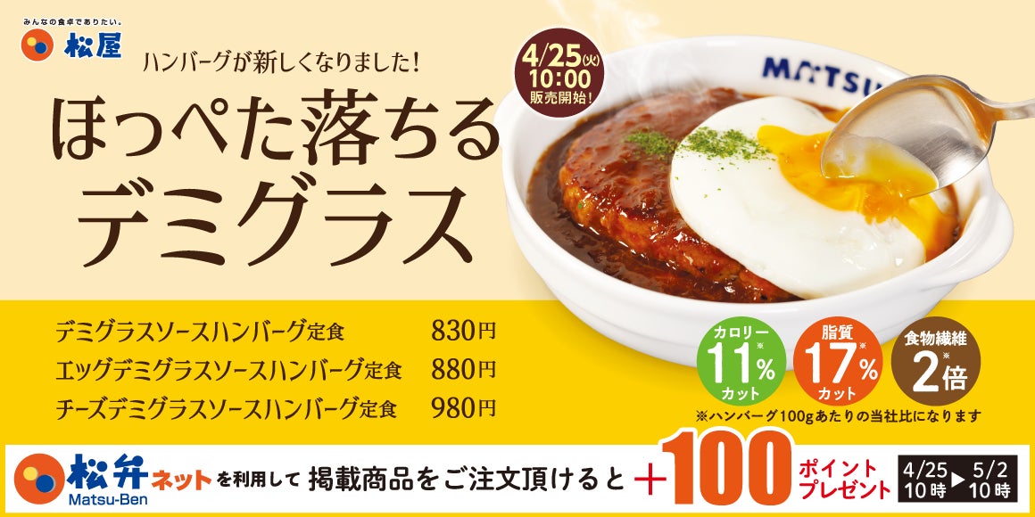 このたび松屋フーズ(本社:東京都武蔵野市、代表取締役社長:瓦葺一利)では、牛めし・カレー・定食・その他丼の「松屋」におきまして、2023年4月25日(火)午前10時より「デミグラスソースハンバーグ定食」を発売いたします。また新ハンバーグの発売に伴い、「ブラウンソースハンバーグ定食」関連メニューは終売となります。