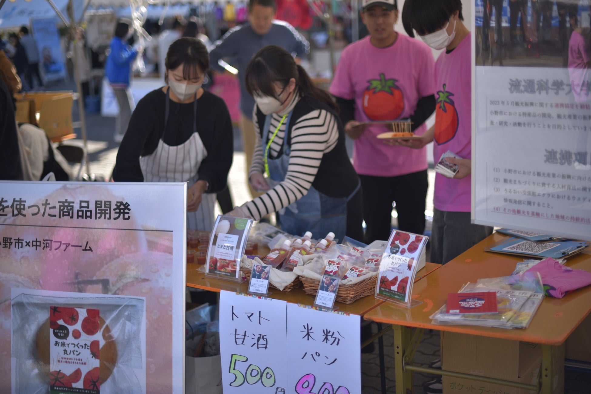 本プロジェクトは西村ゼミが小野市からの依頼で取り組んでいる『特産品認知拡大プロジェクト』の一環で、小野市産の生産物を使った新しい特産品の開発への取り組みです。市内の生産者が作ったトマトを使った「トマト米粉パン」と「トマト甘酒」を企画・製造し、11月9日(土)10日(日)の2日間、流通科学大学の学園祭「りゅうか祭」で試食及びテスト販売を行いました。