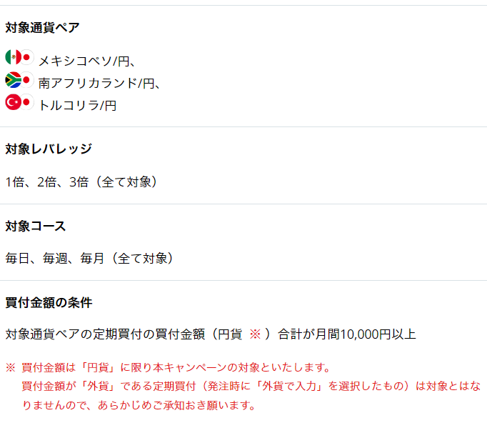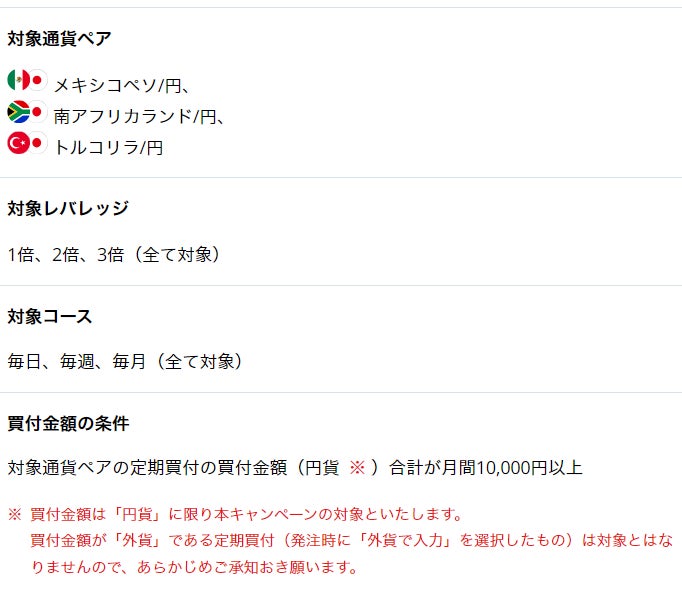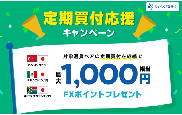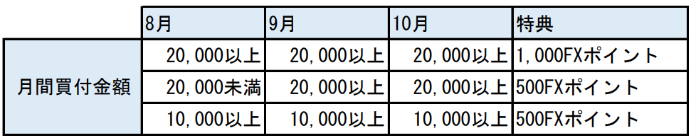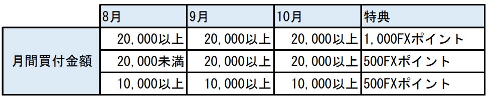 対象期間中の『らくらくFX積立』において、8月~10月の3ヵ月連続で月額2万円以上の定期買付をされたお客様に1,000FXポイントを、月額1万円以上の定期買付をされたお客様に500FXポイントをそれぞれプレゼントいたします。