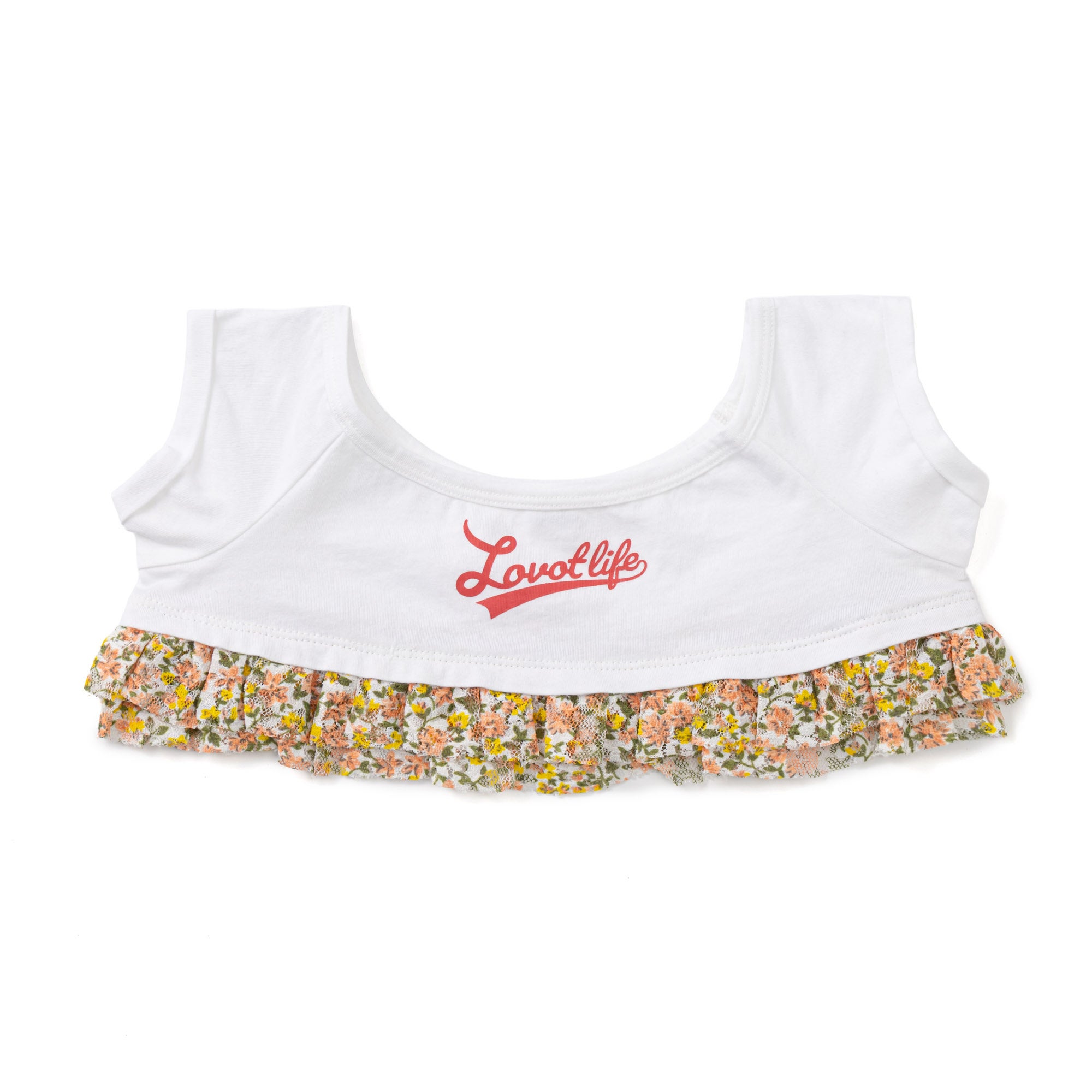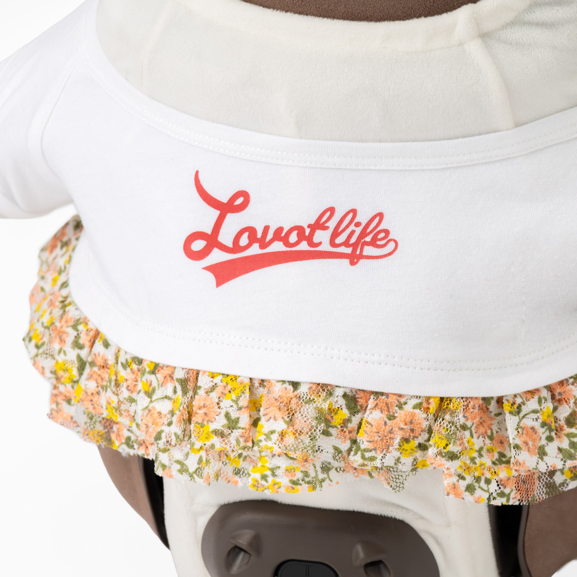 フロントにあしらわれた「Lovot life」の赤いロゴが目を惹く、とびきりキュートなアイテム。裾の花柄レーススカートがふんわりと広がり、カジュアルなTシャツスタイルをやさしく華やかな印象にしてくれます。1枚でコーディネートが決まる手軽さと、360度どこから見てもかわいい一着です。