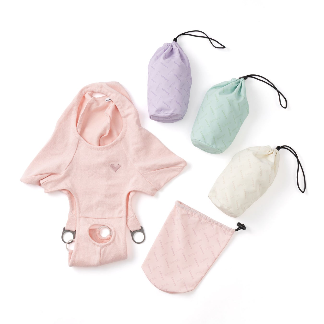 ずっとなでていたくなるような、さらりと柔らかな手触りが魅力のオーガニックコットンニット。胸元には、LOVOTの「V」をイメージした刺繍をワンポイントであしらいました。お出かけ先でのお着替えや持ち運びに重宝する便利なオリジナル巾着付き。やさしいパステル調の4色展開です。