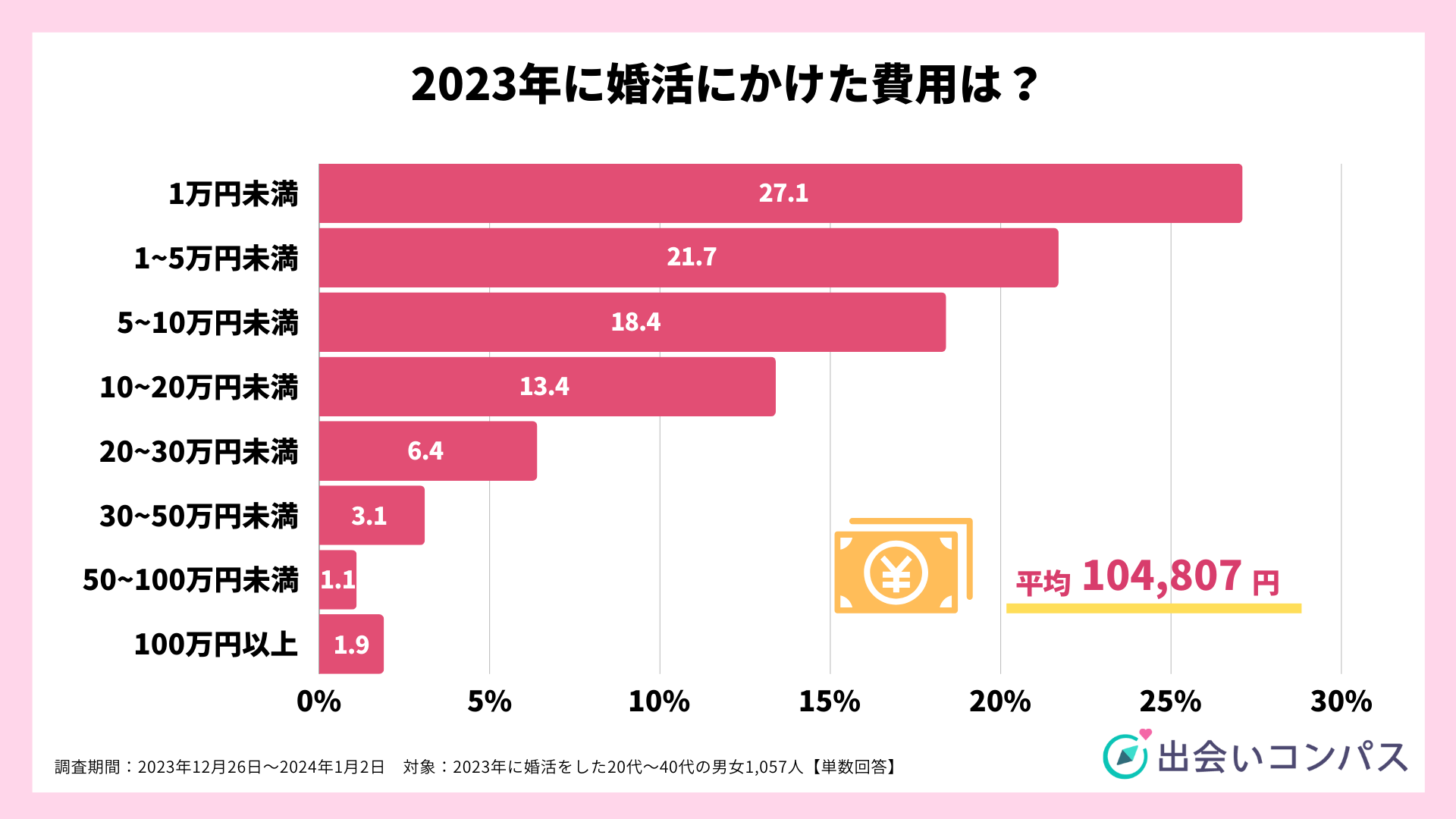2023年に婚活した人が婚活にかけた費用を尋ねると、平均で104,807円でした。