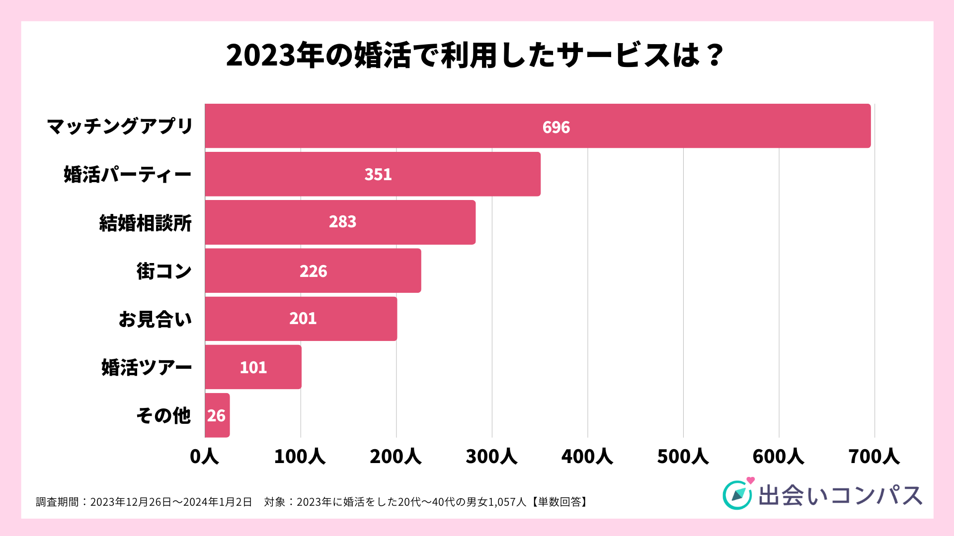 婚活で利用したサービスについて調査したところ、最も多かったのは「マッチングアプリ(696人)」で、全体の65.5%が利用していました。