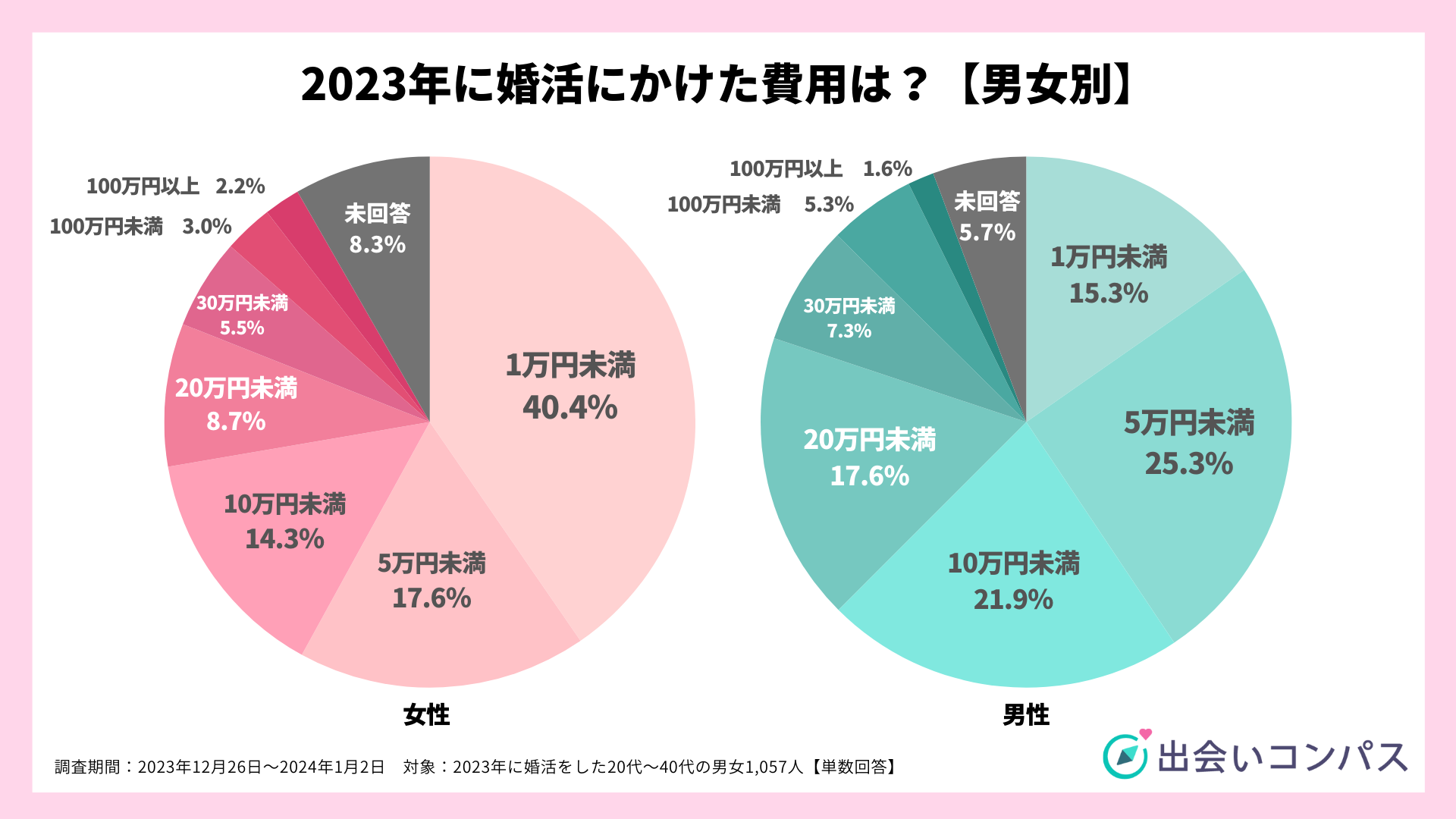年間での婚活費用が1万円未満の割合は女性が40.4%に対し、男性は15.3%と倍以上の差が見られました
