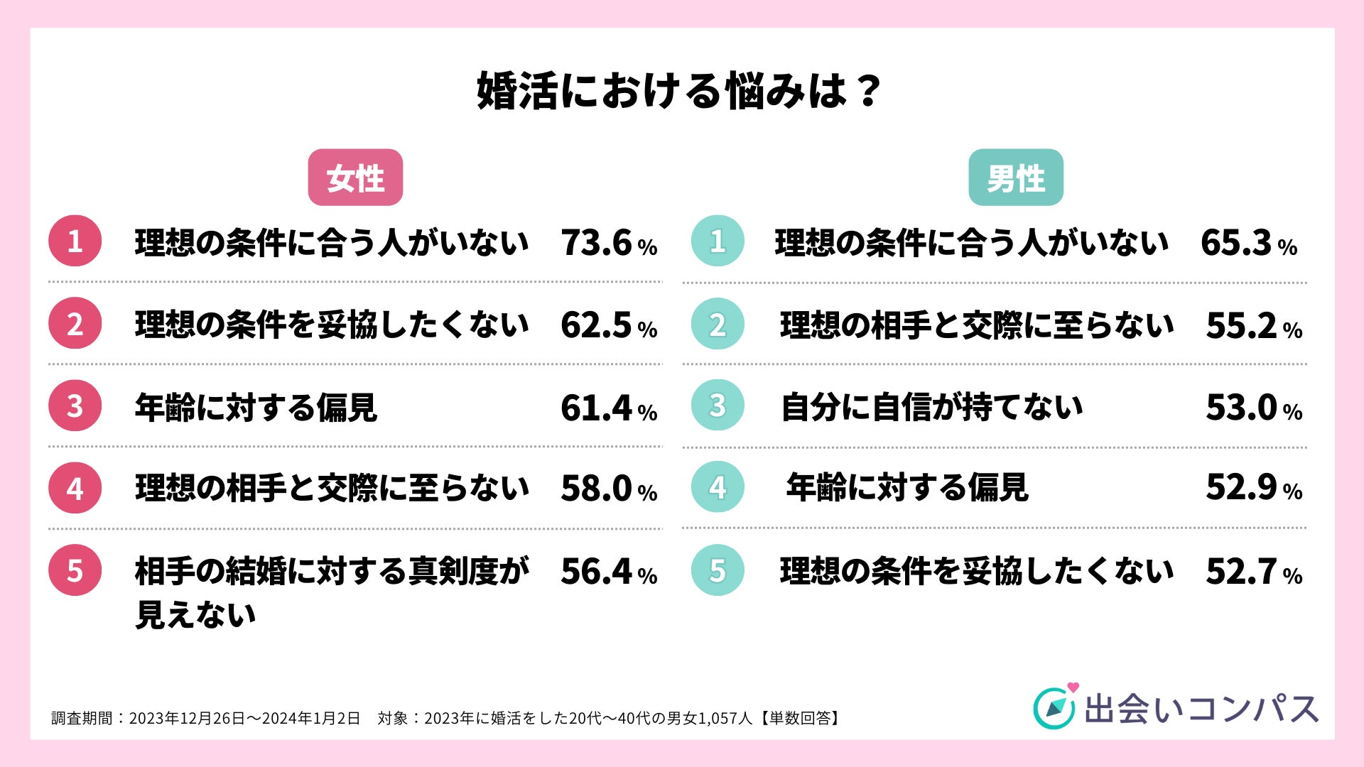 続いて、婚活における悩みについて聞いたところ、1位は男女ともに「理想の条件に合う人がいない」でした。