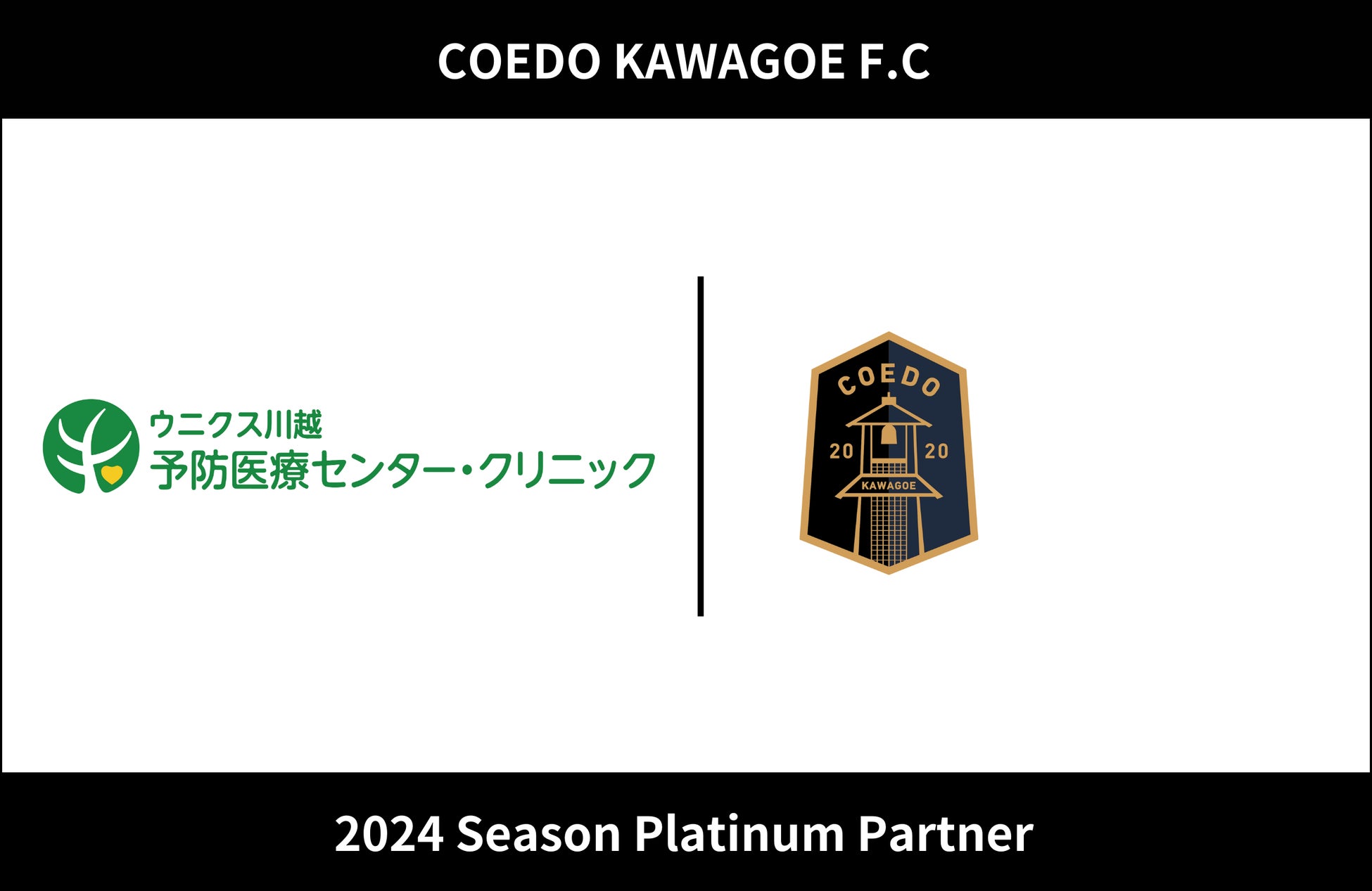 COEDO KAWAGOE F.Cを運営するCOEDO KAWAGOE F.C株式会社(埼玉県川越市、代表取締役 有田和生)は、健康維持、増進、早期発見、早期治療を行う質の高い人間ドック・健診施設であるウニクス川越予防医療センター・クリニック(埼玉県川越市、院長 清水正雄)と2024シーズンのプラチナパートナー契約を更新したことを発表いたします。