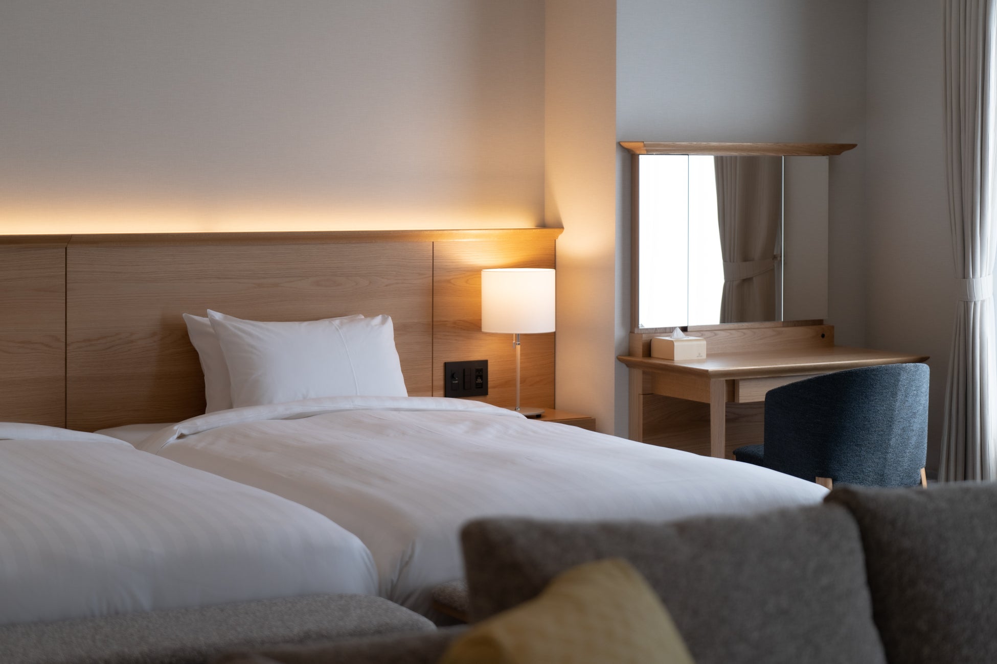 木の暖かさを感じるグジュアリーなお部屋でございます。家具をオーダーメイドで揃えることで、統一感があり、心休まる客室を作り上げております。