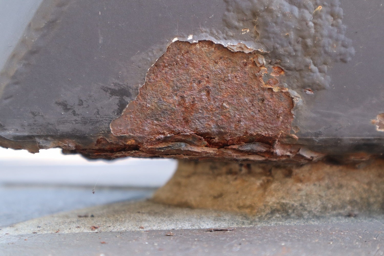 トニー・スミスの《アマリリス》(1)は、マットな黒が印象的な幾何学形態の彫刻作品です。作品の周りを回ると構成が絶えず変化して見え、開館以来、鑑賞者を楽しませてきましたが、近年、塗装の劣化により退色が進行し、亀裂、はげ落ち、さびが生じ、白色の下地が露出しています。地面に接する部分では、動物の尿かけによる腐食が進行し、層状の大きなさびの破片が落ちはじめています(2)。