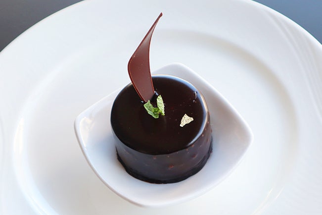 ココアのグラサージュでコーティングしたムースの中にふわっと香るミントクリームがポイントです。