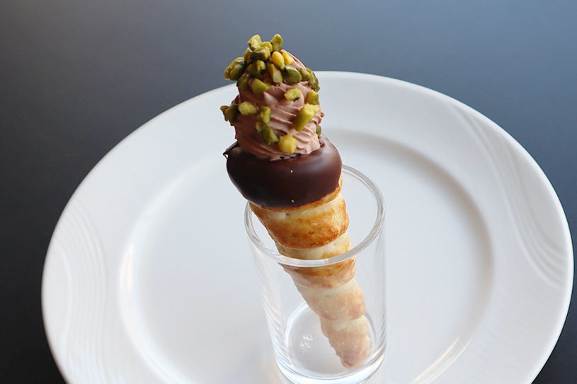 クルクルと巻いて焼き上げたパイ生地にチョコクリームを絞りました。サクサク食感のひんやりコルネパイをお楽しみください。