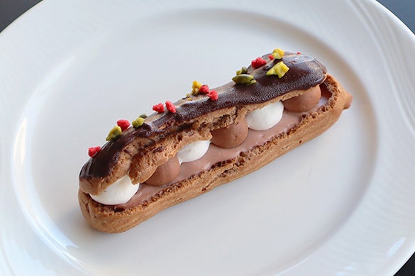 チョコレートのシュー生地に『ラズベリーカスタード』『生クリーム』『チョコレートクリーム』が彩る可愛らしいエクレアです。