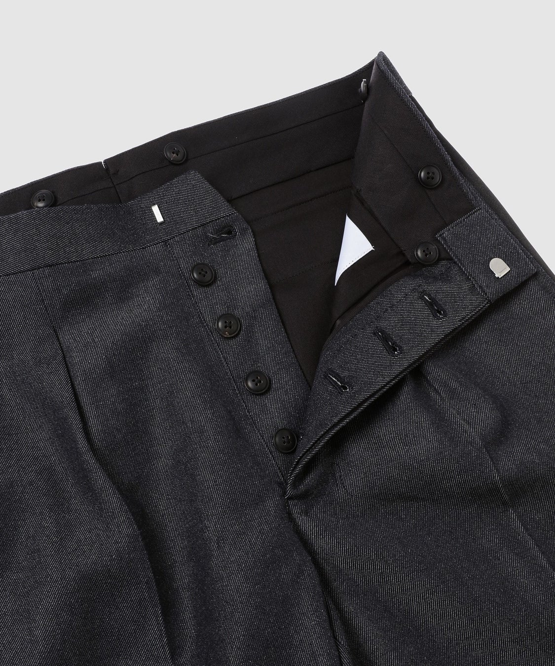 今回販売するZOZOVILLA別注のセレモニーウェア「WOOL DENIM TUXEDO」は、本アイテムのために開発した特製ウールサージを表地に採用し、同ブランドオリジナルのデニム生地を基にした染色と織りでデニムの風合いを表現しています。ラペルや側章にはシルク100%のダブルサテンを使用し、深みのある黒と上質な光沢、しなやかなドレープがタキシード全体を華やかに引き立てています。伝統的なテーラリングを踏襲したクラシックなスタイルに、SUGARHILLの特徴でもあるミリタリーやワークに通じる武骨さを融合し、素材本来の魅力を最大限に引き出した1着です。