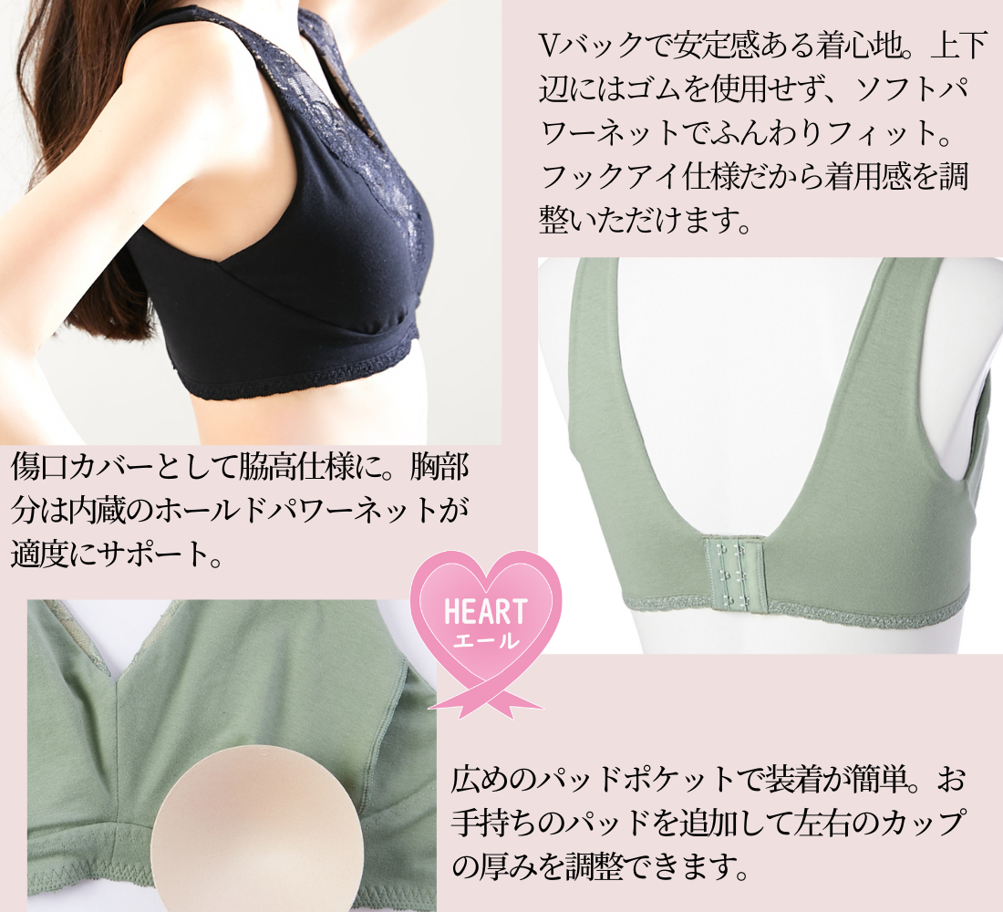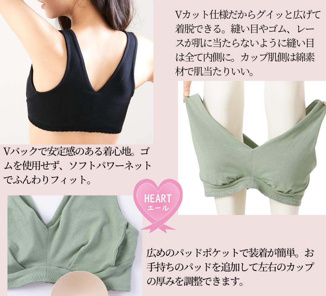 このたび販売を開始するのは、縫い目やゴムが肌に当たらない「ハートエール」ならではの設計はそのままに、ソフトパワーネットでふんわりフィットするノンワイヤータイプで、ホックやボタンによる着脱が困難な方に向けたハーフトップタイプと、着用感をご自身で調整できるフックアイ仕様タイプの2商品です。