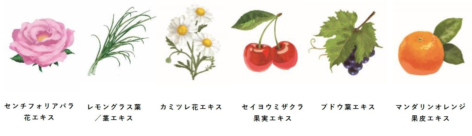 ※1 マンダリンオレンジ果皮エキス、セイヨウミザクラ果実エキス、レモングラス葉/茎エキス、ブドウ葉エキス、センチフォリアバラ花エキス、カミツレ花エキス