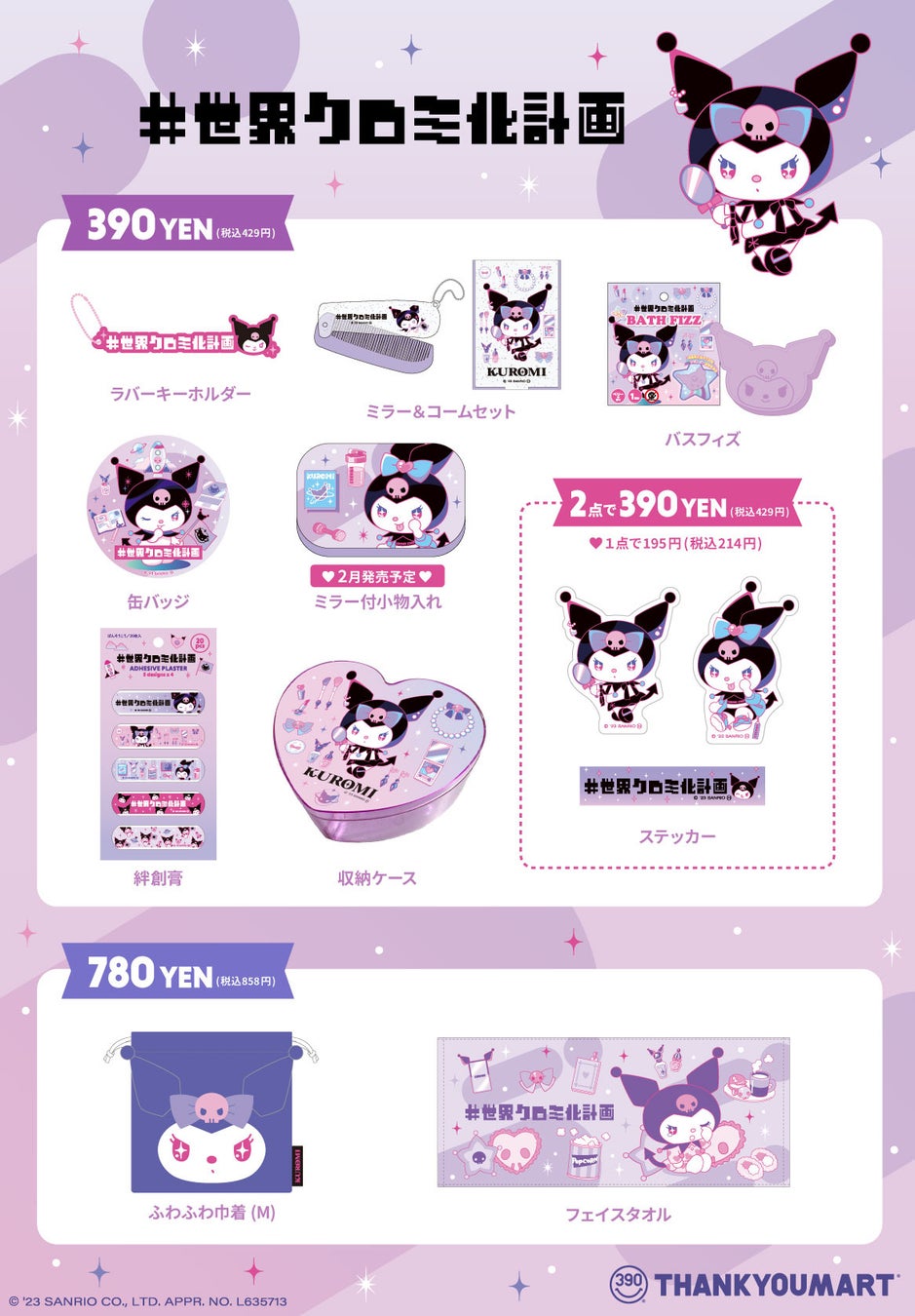 390円(税込429円)を中心としたかわいいアイテムが集まるショップ「サンキューマート」を運営するエルソニック株式会社は、株式会社サンリオの人気キャラクターである『クロミ』が手がけるプロジェクト『#世界クロミ化計画』とコラボした限定アイテムを全国のサンキューマート店舗と公式オンラインショップで1月中旬より入荷順次販売開始いたします。