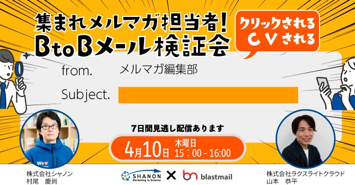 そこで今回は、マーケティングオートメーションを提供しているシャノンと、メール配信システム「ブラストメール」を提供しているラクスライトクラウドの2社で、自ら実践して培ったメールノウハウを視聴者の皆さまといっしょに検証していきます。