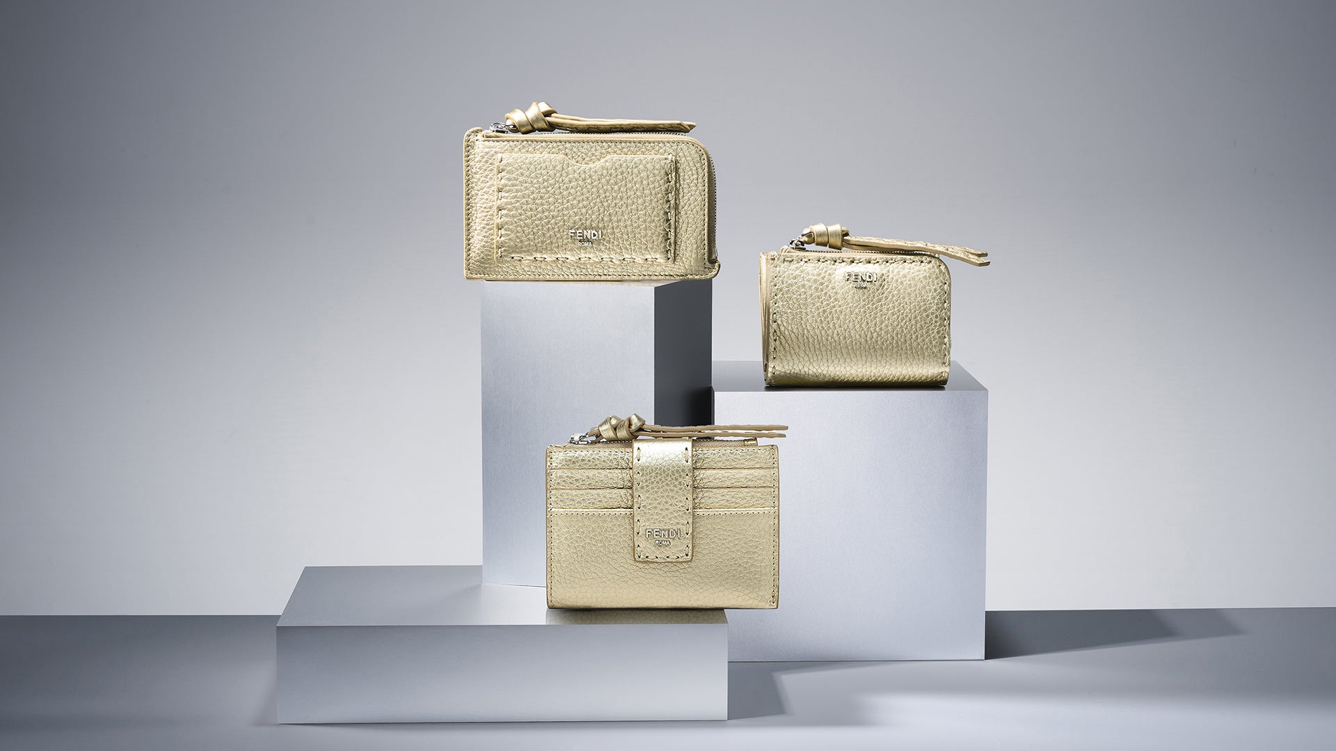 創業以来の伝統を受け継ぎ、ローマの馬具職人の技術とクラフツマンシップを現代に解釈したメゾンのアイコニックな「セレリア(Selleria)」ラインのスモールレザーグッズ。「セレリア」の特徴である最高級カーフレザー「クオイオ ローマ(Cuoio Roma)」を使用し、同色のステッチが丁寧に手作業で施されています。ウィメンズでは人気のアイコンバッグ 「ピーカブー(Peekaboo)」のエッセンスを踏襲した、ホリデーシーズンにふさわしいリュクスなシャンパンゴールドが仲間入り。ノットディテールのジッププルと、トーン・オン・トーンの「FENDI」ロゴが、上品な光沢を放つレザーにアクセントを添えます。メンズでは明るいイエローカラーが新たに登場し、多くのカードスロットを備えた長財布や、コインケース付きの実用的な二つ折り財布、コンパクトなデザインのカードケースなど、実用的で使い心地の良いアイテムを数多く展開しています。ダークブラウンのライニングが、デザインにコントラストを効かせています。